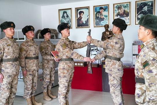 圖為第79集團(tuán)軍某旅“雷鋒班”班長牟振華(左四)將“雷鋒槍”交接給新入班戰(zhàn)士蔣佳恒(右二)。 張永進(jìn) 攝
