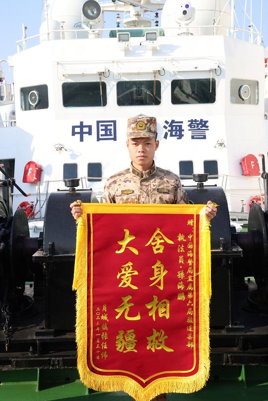 圖為中國(guó)海警局直屬第六局黃鷹艦執(zhí)法員接受錦旗。
