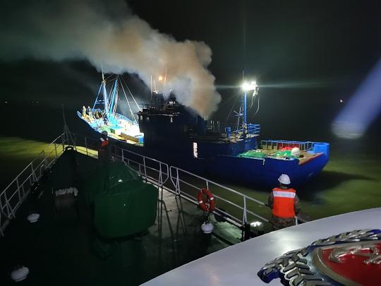 圖為滄州海警局執(zhí)法艦艇靠泊失去動(dòng)力漁船。