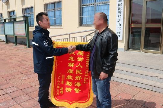 圖為劉某向威海海警局乳山工作站執(zhí)法員送錦旗表示感謝。