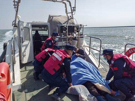 圖為東營(yíng)海警局執(zhí)法員救助受傷漁民。