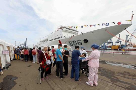 圖為2022年11月11日,“和諧使命—2022”任務(wù)醫(yī)療服務(wù)在印尼雅加達(dá)丹戎不碌港碼頭和“和平方舟”號醫(yī)院船上同時如期展開。蒲海洋 攝