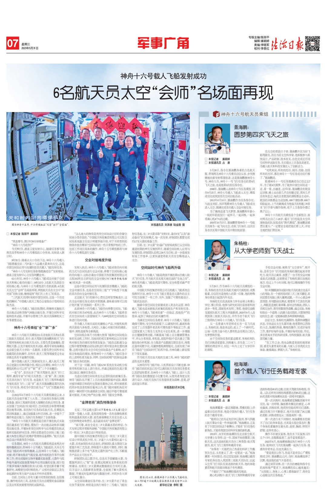神舟十六號(hào)航天員乘組由1名首批航天員和2名第三批航天員組成。其中,航天駕駛員景海鵬和航天飛行工程師朱楊柱來(lái)自航天員大隊(duì),主要負(fù)責(zé)直接操縱、管理航天器,以及開(kāi)展相關(guān)技術(shù)試驗(yàn)。載荷專家桂海潮是北京航空航天大學(xué)的一名教授,主要負(fù)責(zé)空間科學(xué)實(shí)驗(yàn)載荷的在軌操作,在科學(xué)、航天工程等領(lǐng)域受過(guò)專業(yè)訓(xùn)練且具有豐富操作經(jīng)驗(yàn)。