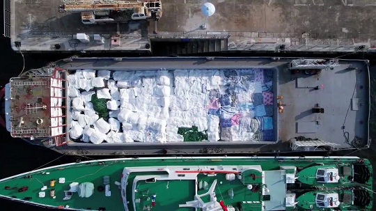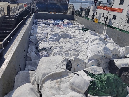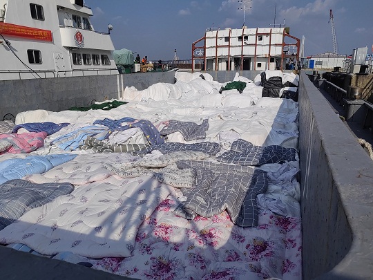 經(jīng)查,該嫌疑船為鐵質(zhì)運(yùn)輸船,駕駛臺(tái)后方為貨艙,貨艙內(nèi)裝有白色和黑色塑料編織袋,袋內(nèi)有來源不明的牛肉、牛腩、牛肚、牛筋、驢雜等凍品約485噸,案值約4000萬元,隨船人員均未能提供船上所裝載貨物的相關(guān)合法來源證明,執(zhí)法員依法對(duì)該船舶和凍品進(jìn)行扣押。