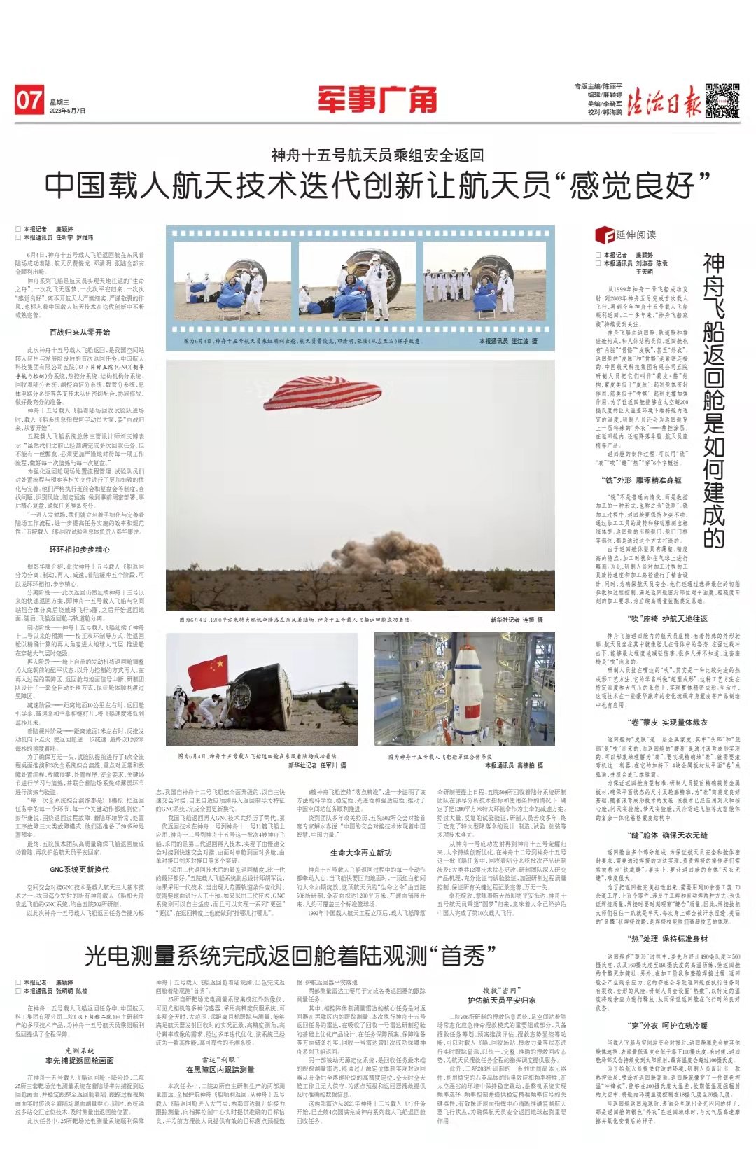 6月4日,神舟十五號載人飛船返回艙在東風(fēng)著陸場成功著陸,航天員費俊龍、鄧清明、張陸全部安全順利出艙。