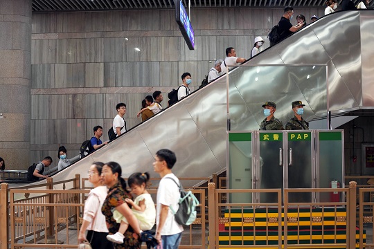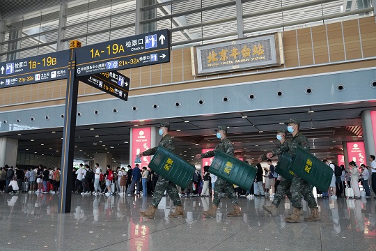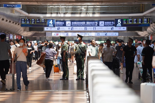 “結(jié)合持續(xù)高溫天氣和客流量增多帶來的執(zhí)勤壓力,我們及時對勤務部署進行優(yōu)化,增派巡邏哨兵觀察上報客流情況并積極為旅客提供暖心服務,安排專人到哨位送清涼減輕惡劣天候影響,確保執(zhí)勤任務圓滿完成、確保旅客能夠安全順利出行。”北京西站守衛(wèi)分隊指導員劉冠群說。