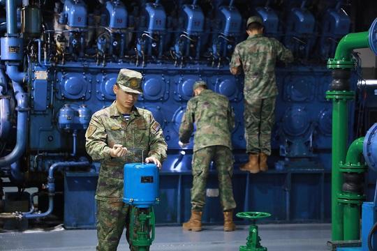 圖為海軍某通信部隊官兵對柴油機進行檢修維護。