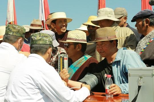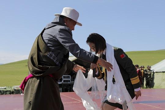圖為藏族群眾為演員獻哈達。朱曉坷 攝