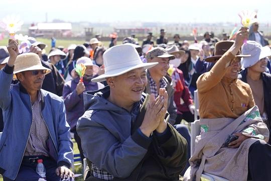 “唱支山歌給黨聽,我把黨來比母親……”一曲《唱支山歌給黨聽》拉開文藝演出序幕。歌曲終了,甘河子鄉(xiāng)副鄉(xiāng)長拉本加感慨地說:“好日子都是共產(chǎn)黨給的,黨的恩情我們不能忘。”