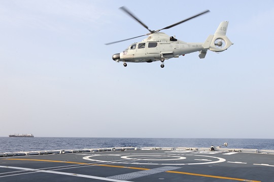 安全感來(lái)自護(hù)航編隊(duì)的積極作為。7月27日傍晚,淄博艦艦載直升機(jī)起飛,赴周邊海域巡邏警戒。當(dāng)發(fā)現(xiàn)直升機(jī)在船舶上空飛過(guò),船員們激動(dòng)地出艙招手。