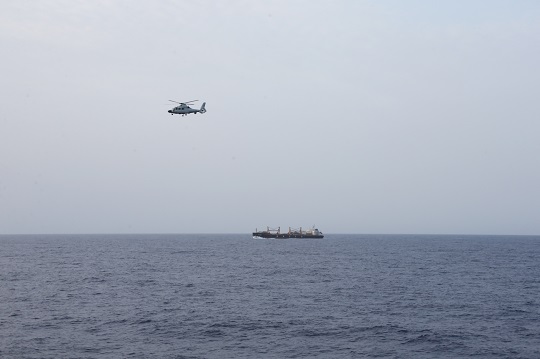 圖為當(dāng)?shù)貢r(shí)間7月26日下午,編隊(duì)指揮艦淄博艦艦載直升機(jī)正在“海瀾之韻”號(hào)商船附近??沼蚓溲策?。孫飛 攝