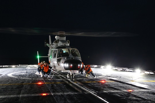 圖為當(dāng)?shù)貢r(shí)間7月26日晚上,編隊(duì)指揮艦淄博艦艦載直升機(jī)完成警戒巡邏后任務(wù)后進(jìn)行夜間著艦。孫飛 攝