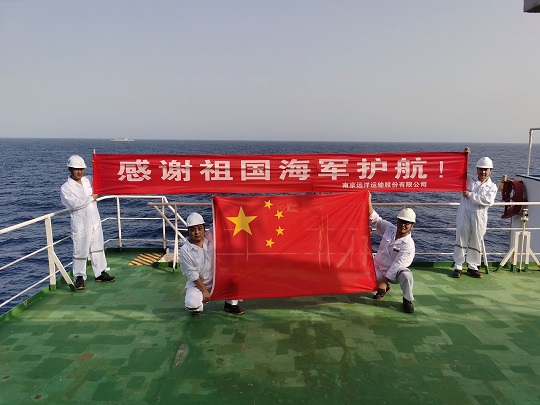 7月27日11時(shí)22分,淄博艦順利將“海瀾之韻”號(hào)商船護(hù)送至接護(hù)點(diǎn)。分別之際,船員們?cè)诩装迳吓e著五星紅旗,并掛出“感謝祖國(guó)海軍護(hù)航”的橫幅。