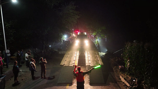 “我們從來沒有在這種環(huán)境下架過橋?!蓖跣裾f,架設時,上方的電線距離車輛僅有30公分,周邊有樹木遮擋阻礙視線。而且,作業(yè)區(qū)域的寬度只有6米多。