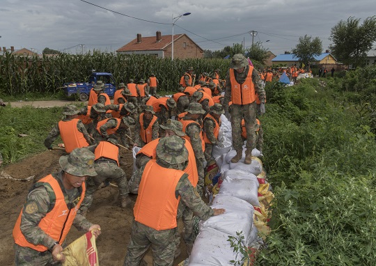 圖為北部戰(zhàn)區(qū)陸軍第78集團(tuán)軍某合成旅和哈爾濱市民兵應(yīng)急分隊(duì)在哈爾濱雙城區(qū)萬(wàn)隆鄉(xiāng)組織堤壩加固。葉挺 攝