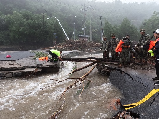 前進路上,折斷的樹木和電線桿倒伏在河道,部分路基被河水全部掏空,路面整段塌陷下去?!翱禳c,再快一點,把情況摸清楚!”朱鵬宇和戰(zhàn)友們在沒過小腿的洪水中加速挺進。