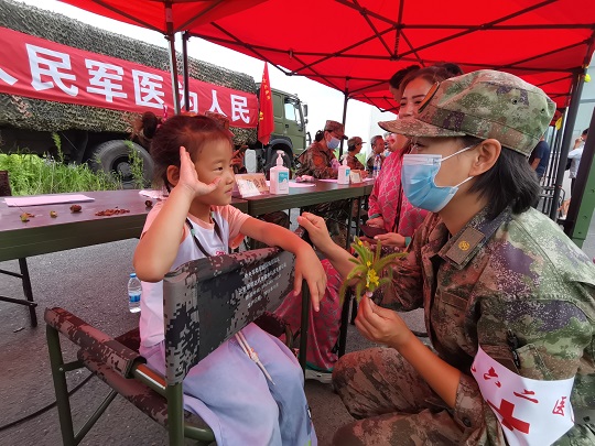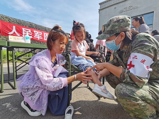 “寶貝兒放心,阿姨一定仔細(xì)給你瞧瞧,對(duì)癥用藥之后,就不會(huì)又癢又疼了?!贬t(yī)療隊(duì)員孟博從診斷席上走出來(lái),將小女孩兒抱上軍用折疊椅,輕輕地?cái)]起小女孩兒的褲腿,發(fā)現(xiàn)小腿局部皮膚會(huì)出現(xiàn)紅腫、水皰,且有明顯瘙癢等癥狀,初步診斷為被毒蚊叮咬浸水感染。隨即對(duì)其創(chuàng)面清潔、消毒、涂藥,之后又給她贈(zèng)送了止癢、消腫、消炎等藥品,并向她媽媽交代了注意事項(xiàng)。