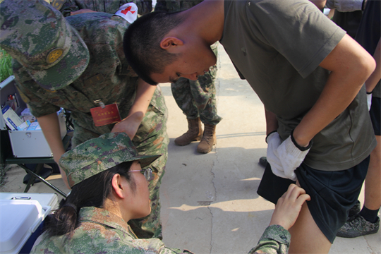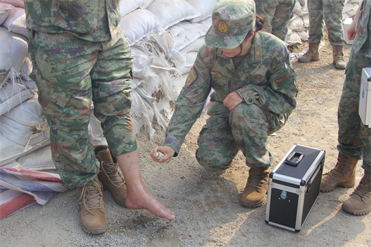 醫(yī)療隊(duì)抵達(dá)任務(wù)區(qū)域后,隊(duì)員們展開醫(yī)療救治工作。前線的戰(zhàn)士們由于蚊蟲叮咬和洪水長(zhǎng)期浸泡,部分官兵出現(xiàn)感冒中暑、腹瀉濕疹、扭傷擦傷、皮膚潰爛等傷病情況。醫(yī)療隊(duì)迅即展開診療,對(duì)患病官兵開方拿藥,對(duì)尚未患病官兵講授預(yù)防,僅第一日便巡診180人次,處理傷口6人,開展健康防護(hù)科普宣教3場(chǎng)次。