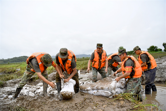 在某合成旅,眼看著水位越漲越高、水流越來越急、塌方越來越大,從旅長(zhǎng)到列兵,大家冒雨喊著“人在堤在”口號(hào),一刻不停地鏟沙土、裝沙袋、堆沙墻。列兵鐘習(xí)文患有精索靜脈曲張,因長(zhǎng)時(shí)間泡在水里導(dǎo)致墜脹和疼痛讓他直冒冷汗。身上痛手上活卻沒停,他一次又一次背著沙袋,一路小跑沖向河堤。