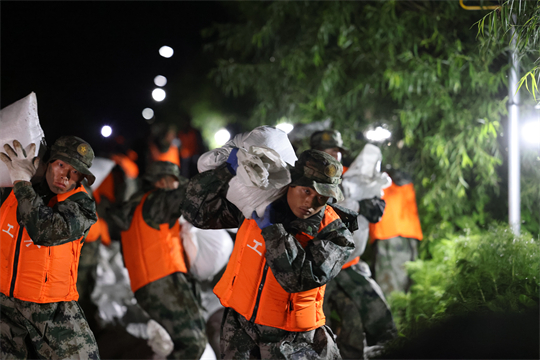 圖為北部戰(zhàn)區(qū)陸軍某旅官兵在吉林省吉林市舒蘭市金馬鎮(zhèn)執(zhí)行加固堤壩任務(wù)。沈旭辰 攝