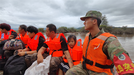 圖為北部戰(zhàn)區(qū)陸軍某旅黨員突擊隊(duì)在哈爾濱市五常市沙河子鎮(zhèn)大貴村利用沖鋒舟轉(zhuǎn)移受困群眾。王麒淞 攝
