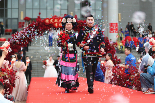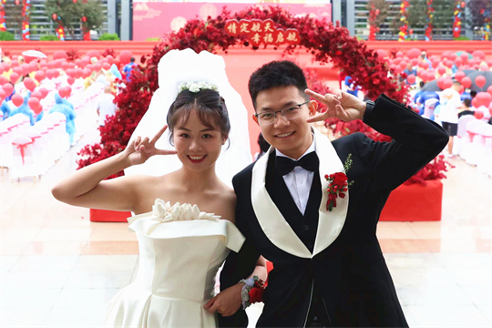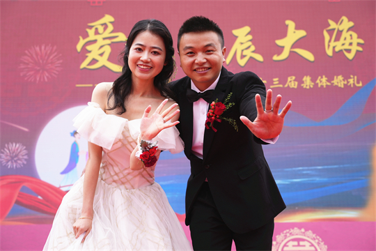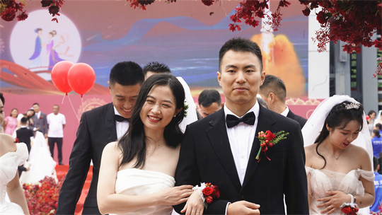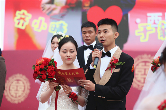 舞臺、氣球精心裝扮,美景、佳人喜迎幸?!槎Y現(xiàn)場,新郎們身著深色西裝,筆挺英??;新娘們身穿潔白婚紗,美麗動人。一個個精心設(shè)置的儀式,一張張洋溢幸福的笑臉,讓這場集體婚禮甜蜜加倍、幸福爆表。
