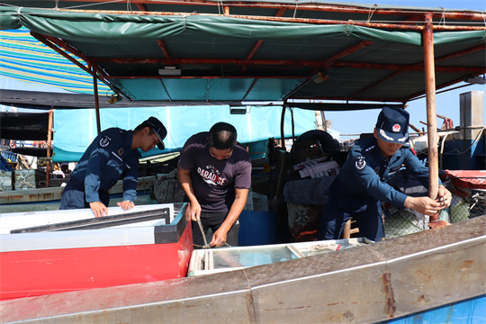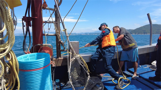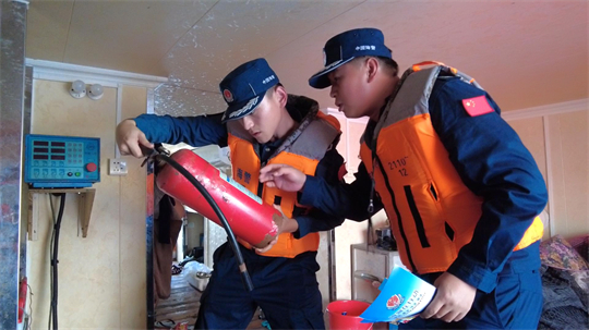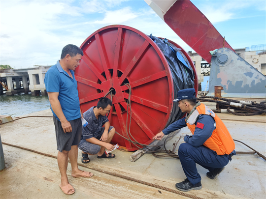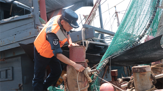 圖為海警執(zhí)法員檢查漁船安全設(shè)施。
