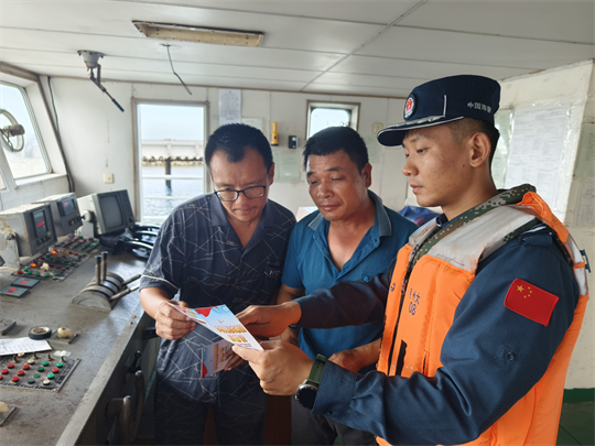 圖為海警執(zhí)法員開展防臺(tái)防汛宣傳。