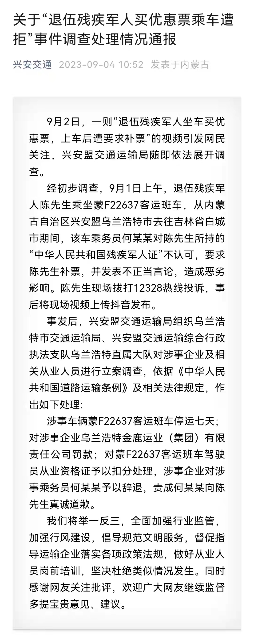 經(jīng)初步調(diào)查,9月1日上午,退伍殘疾軍人陳先生乘坐蒙F22637客運(yùn)班車,從內(nèi)蒙古自治區(qū)興安盟烏蘭浩特市去往吉林省白城市期間,該車乘務(wù)員何某某對(duì)陳先生所持的“中華人民共和國(guó)殘疾軍人證”不認(rèn)可,要求陳先生補(bǔ)票,并發(fā)表不正當(dāng)言論,造成惡劣影響。陳先生現(xiàn)場(chǎng)撥打12328熱線投訴,事后將現(xiàn)場(chǎng)視頻上傳某視頻平臺(tái)發(fā)布。