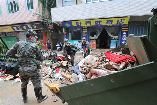 圖為武警第二機動總隊某支隊救援官兵在搬運受損物資。薛東東 攝