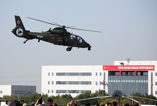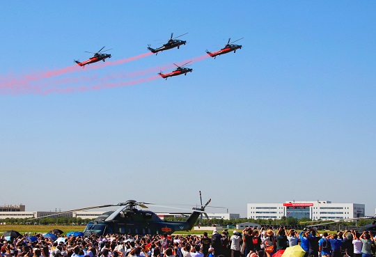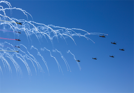 圖為陸軍“風(fēng)雷”飛行表演隊(duì)直-10武裝直升機(jī)進(jìn)行飛行表演。張永進(jìn) 攝
