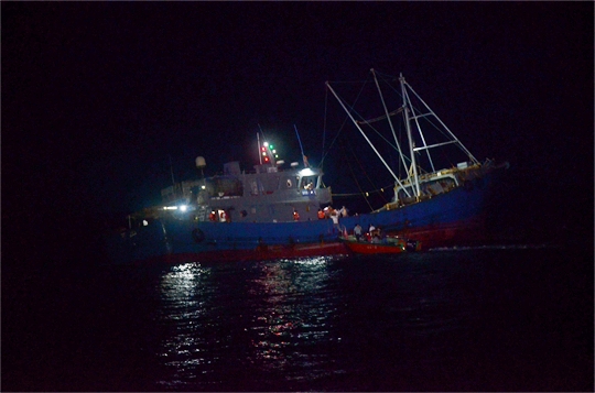 圖為執(zhí)法艇靠幫接送被困船員。