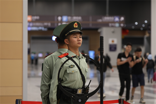 圖為執(zhí)勤哨兵認(rèn)真觀察旅客出行情況。陳春越 攝