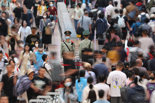 圖為執(zhí)勤哨兵佇立在流動(dòng)的旅客人群中。陳春越 攝