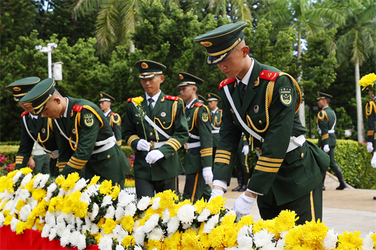 圖為武警海南總隊(duì)官兵在解放海南島戰(zhàn)役烈士陵園祭奠革命烈士時(shí)向革命烈士敬獻(xiàn)鮮花。