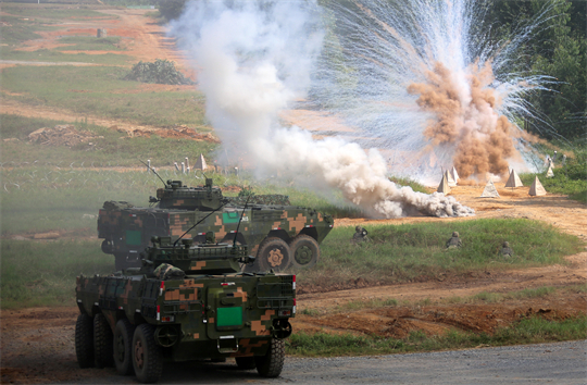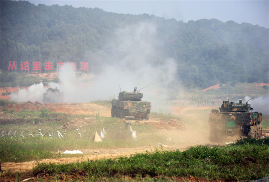 圖為第74集團(tuán)軍某旅“生死在一起連”開展實(shí)兵戰(zhàn)術(shù)演練,連隊(duì)?wèi)?zhàn)車占領(lǐng)前沿陣地。