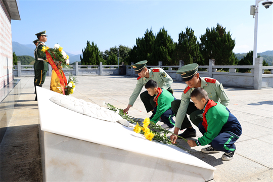 圖為武警官兵與駐地學(xué)生向革命先烈獻(xiàn)花。