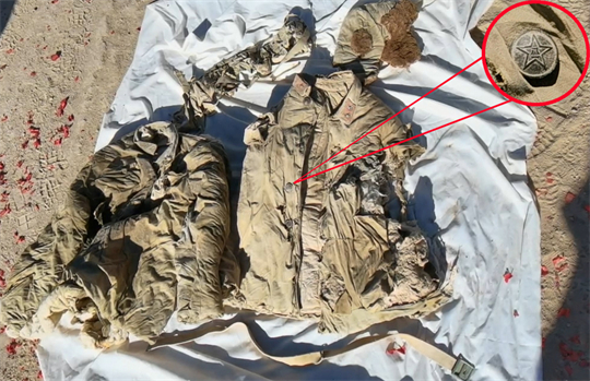 專業(yè)人員在對(duì)遺骸一帶進(jìn)行深度勘查挖掘時(shí),又發(fā)現(xiàn)一些子彈袋、老式解放鞋、軍衣軍帽等舊式軍用品和部分散落骸骨。其中,兩具遺骸較為完整,部分衣扣上鑄有清晰的“八一”字樣,衣領(lǐng)上還有紅色領(lǐng)章,一條破碎的舊毛巾上印有依稀可見(jiàn)的“軍用品”三個(gè)字。