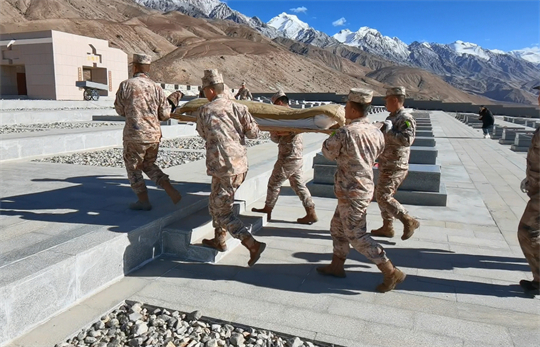 近日,新疆維吾爾自治區(qū)軍地檢察機(jī)關(guān)和退役軍人事務(wù)部門相關(guān)人員來(lái)到康西瓦烈士陵園,共同迎接“失散”多年的英烈遺骸“歸隊(duì)”,8名邊防官兵邁著穩(wěn)重的步伐,輕輕將遺骸放入墓穴中。