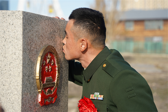 圖為退伍老兵鄧凱深情親吻界碑。任勇 攝