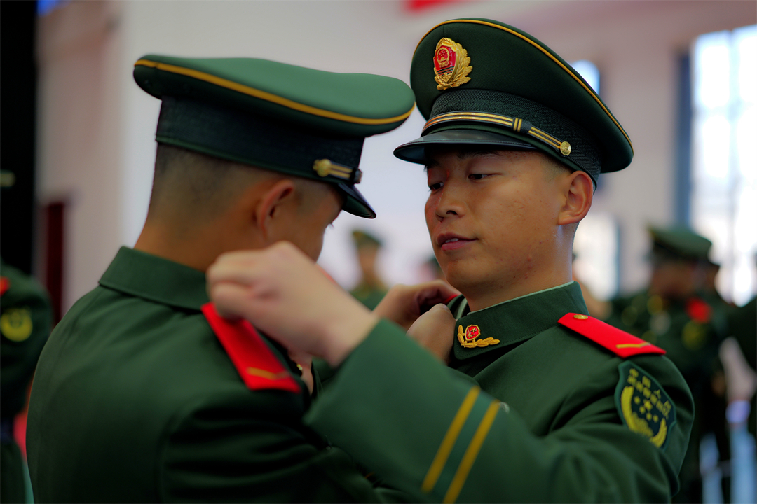 圖為新兵之間相互佩戴軍銜。