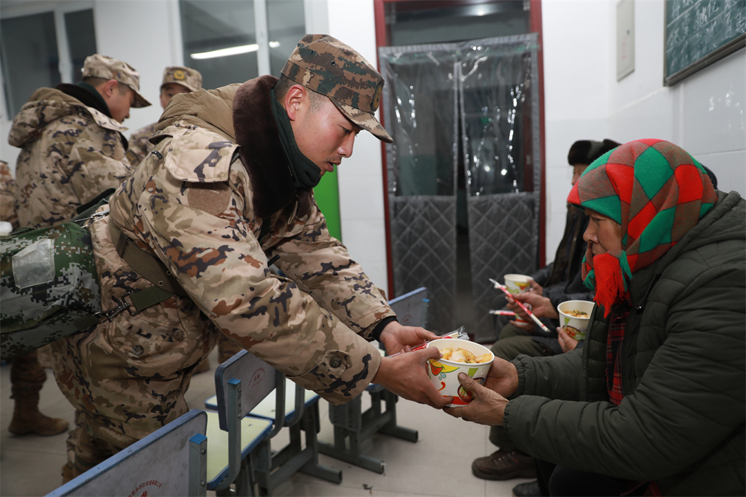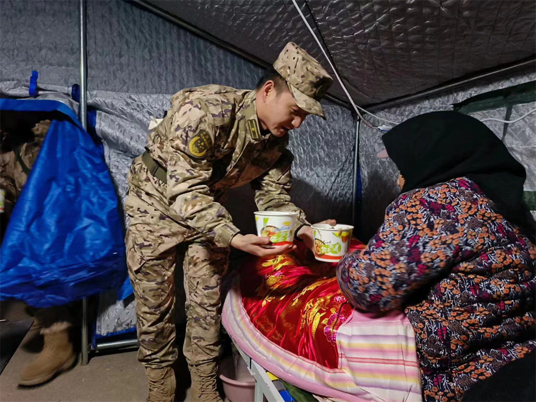 災(zāi)區(qū)海拔較高,天氣寒冷,武警青海總隊(duì)官兵盡全力讓受災(zāi)群眾度過災(zāi)后寒夜。