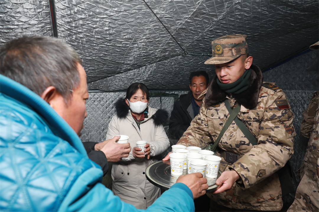 圖為武警青??傟?duì)任務(wù)官兵為受災(zāi)群眾端上熱姜湯。曹展 攝