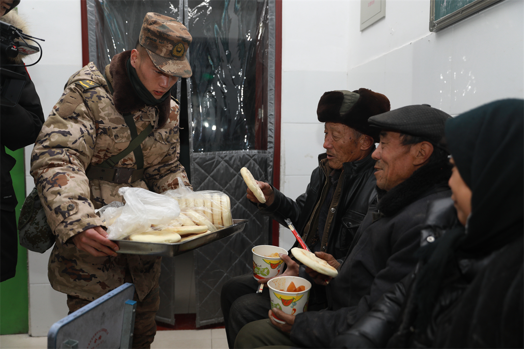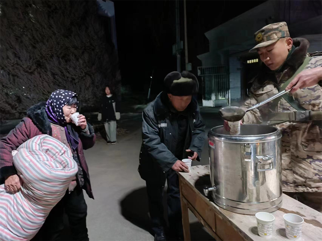 20余名炊事員搭鍋支灶,制作熱食。同時(shí),他們還第一時(shí)間為群眾熬制熱姜湯,驅(qū)寒保暖。經(jīng)過兩個(gè)多小時(shí)忙碌,熱氣騰騰的羊肉粉湯做熟了,配上熱乎乎的餅子,200余名群眾吃上災(zāi)后第一頓熱乎飯。