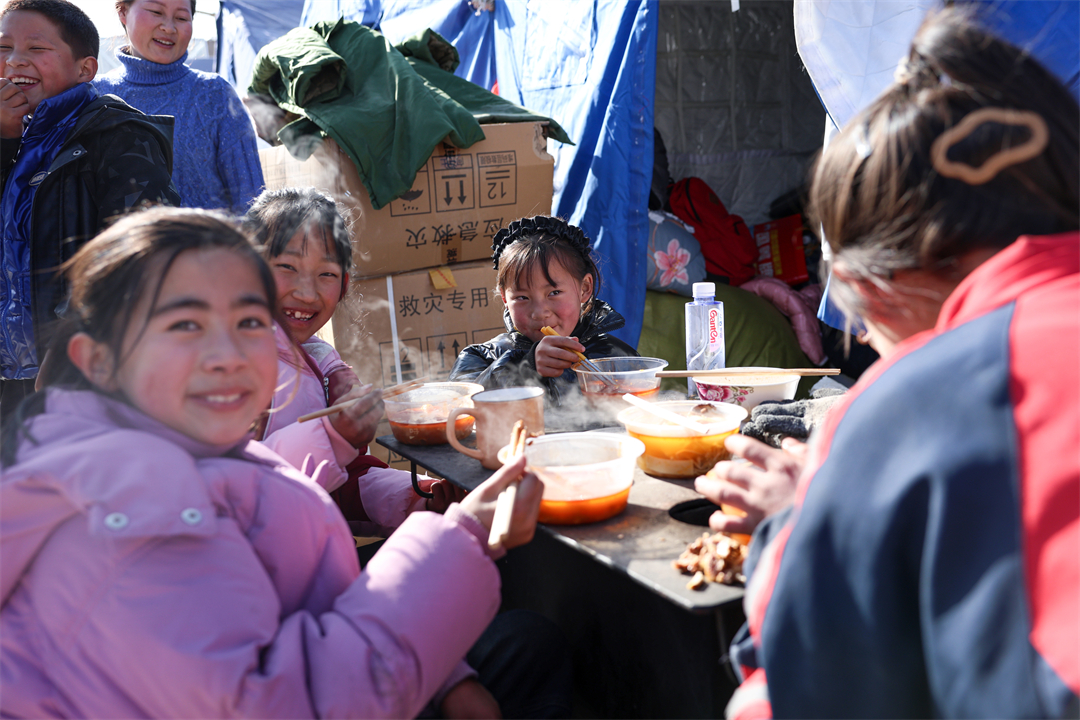 圖為12月21日,在甘肅省臨夏州積石山縣劉集鄉(xiāng)陽屲村安置點,小朋友們吃著武警甘肅總隊臨夏支隊官兵制作的熱食,臉上露出了幸福的笑容。