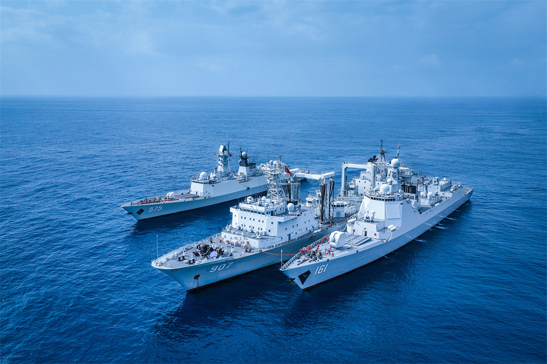圖為2022年2月27日,第40批護(hù)航編隊(duì)利用任務(wù)間隙,在亞丁灣西部某海域組織開(kāi)展錨泊并靠補(bǔ)給,綜合補(bǔ)給艦駱馬湖艦向各艦輸送油、水、食品等物資,為完成后續(xù)任務(wù)打下基礎(chǔ)。胡韋楠 楊捷 攝