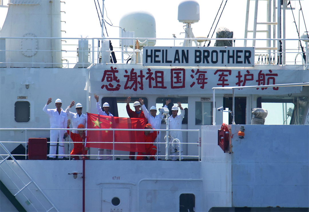 圖為2022年11月5日,在亞丁灣上“海瀾之友”散貨船船員安全感“爆棚”,自發(fā)地懸掛起“感謝祖國(guó)海軍護(hù)航”的橫幅,并跑上甲板,興奮地展開(kāi)五星紅旗,向淮南艦揮手致謝。馬玉彬 攝
