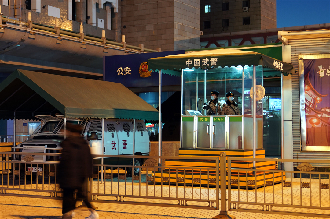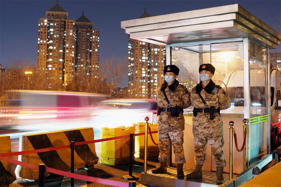 圖為武警星夜堅(jiān)守,保障群眾平安出行。