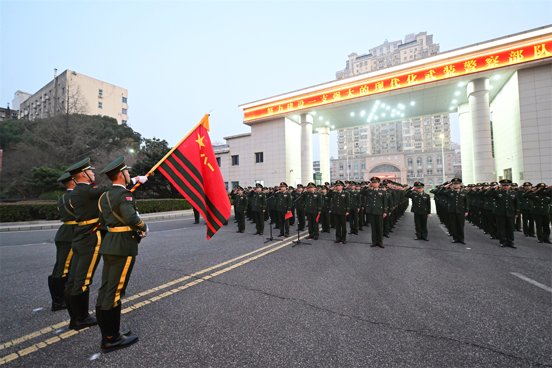 圖為武警江西總隊在機關(guān)營區(qū)舉行“升國旗、迎戰(zhàn)旗、學(xué)訓(xùn)詞”活動。何宗卯 許書燦 攝
