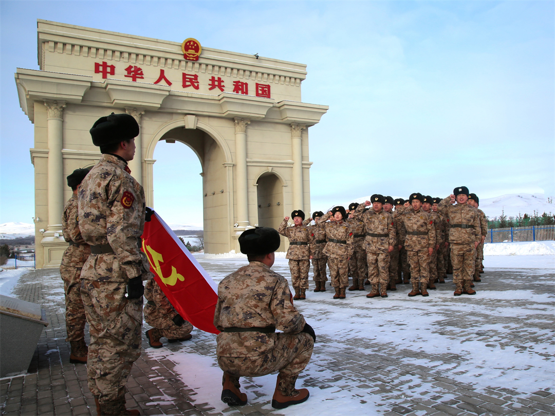 在祖國(guó)北疆的國(guó)門(mén)前,全體人員面向黨旗莊嚴(yán)宣誓。大家緊握的拳頭堅(jiān)定有力,鏗鏘的誓言響徹云霄,表達(dá)著對(duì)黨忠誠(chéng)的堅(jiān)定信仰和為國(guó)防事業(yè)不懈奮斗的決心。
